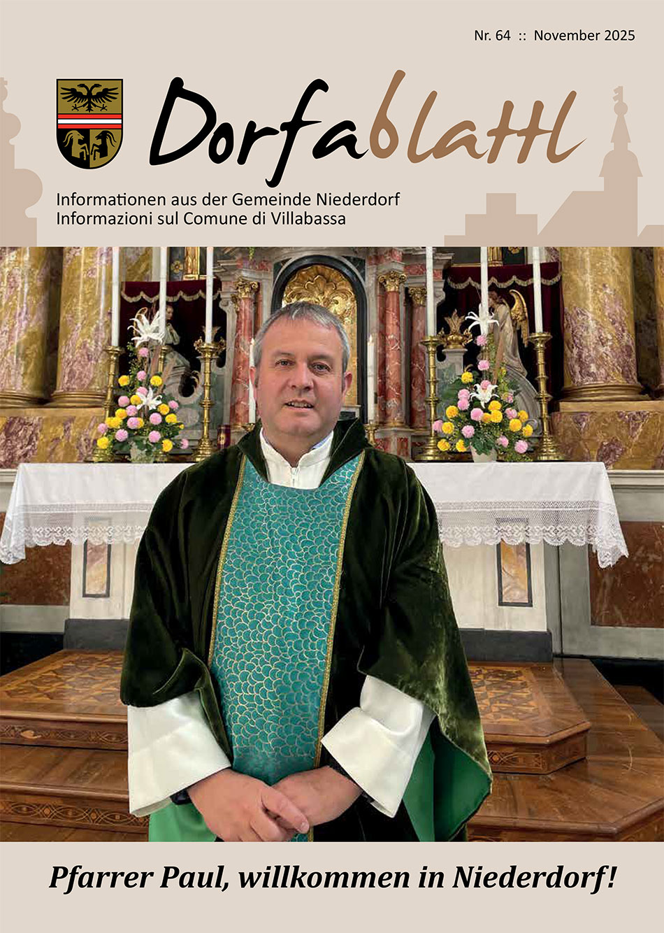 Das „Dorfablattl“ ist die Informationszeitschrift aus der Gemeinde Niederdorf, welche dreimal jährlich (März, Juli und November) erscheint und bietet Informationen über Gemeindeverwaltung, Dorfleben, Geschichte, Veranstaltungen, Vereine, Personen u.v.m.